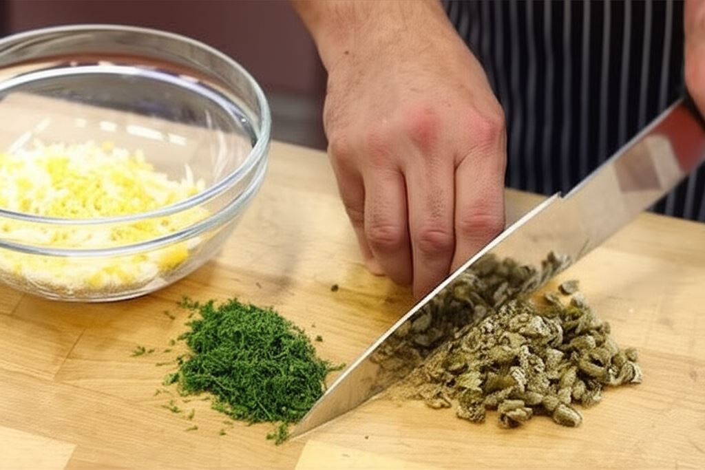 6 jaj ugotuj na twardo, obierz, zetrzyj na tarce o grubych oczkach. Posiekaj natkę koperku i kapary.