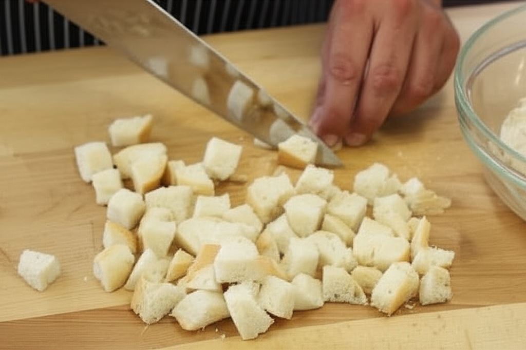 Dwie bułki umieść w misce, zalej wodą, odczekaj aż nasiąkną, po czym odciśnij je starannie. Pozostałą bułkę pokrój w kostkę o grubości 1 cm.