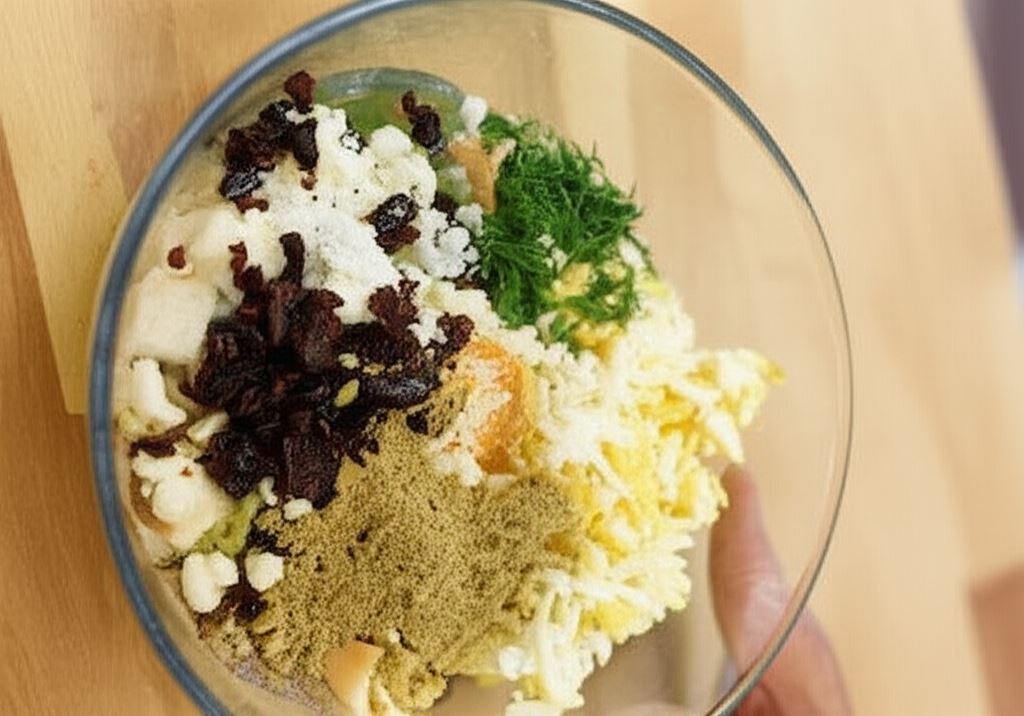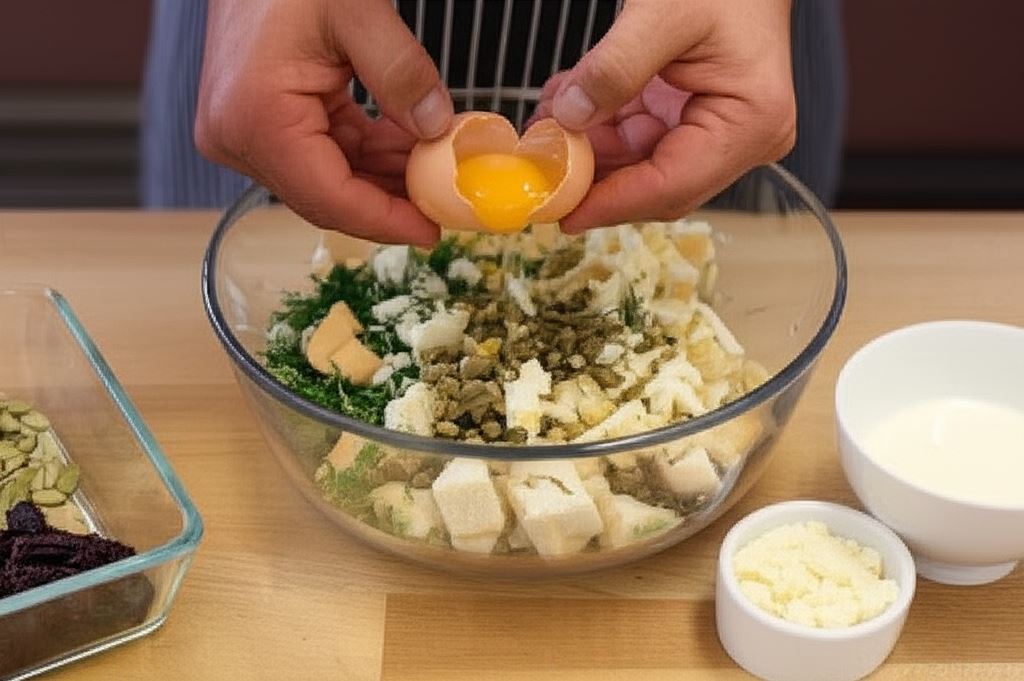 W misce połącz razem odciśniętą bułkę, pokrojoną bułkę w kostkę, śmietanę, 1 surowe jajko, jaja ugotowane na twardo, rodzynki, kapary, parmezan, koperek i pestki dyni.