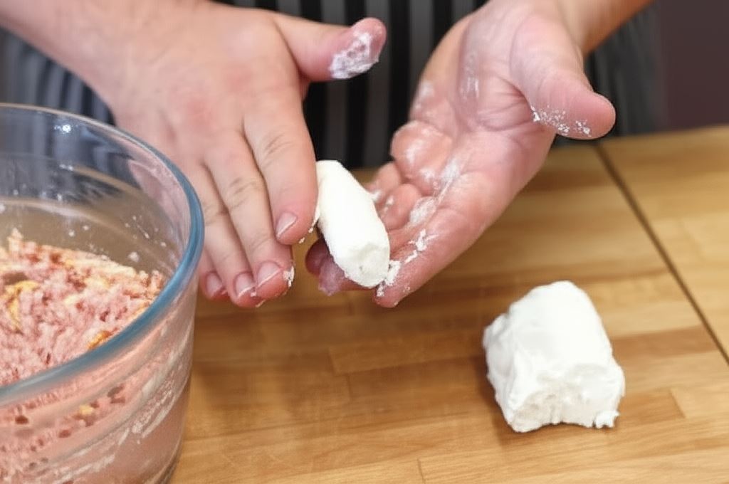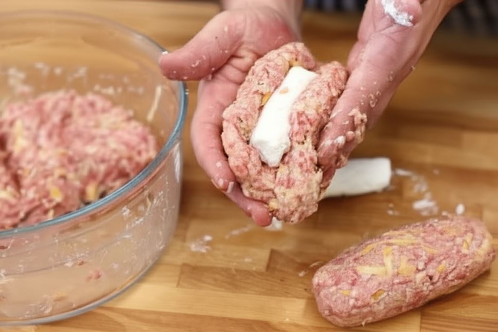 Masę mięsną również rozdziel na cztery porcje. Na środek każdego placka mięsnego połóż porcję sera, oklej starannie mięsem i uformuj kotlety.