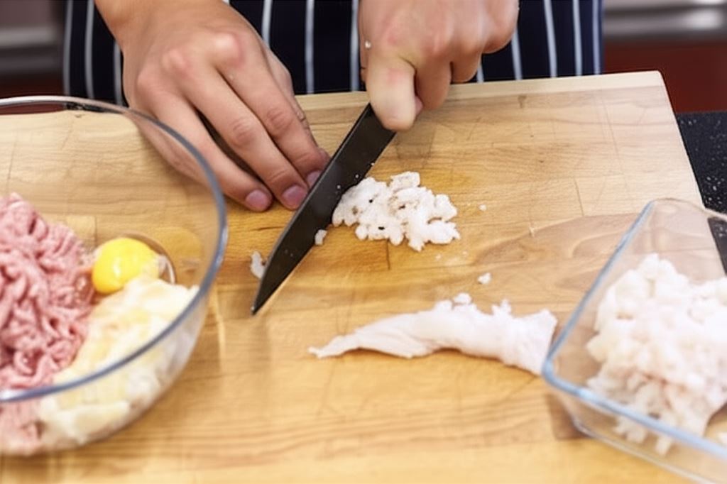 Rybę posiekaj na drobne kawałki nożem, połącz z odciśniętą z mleka bułką, jajkiem i mielonym mięsem.