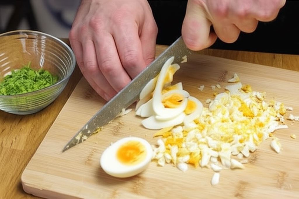Posiekaj drobno natkę pietruszki i ugotowane jajka.