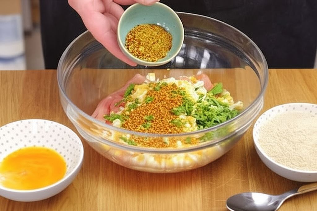 Mięso umieść w misce, wsyp posiekane jajko i natkę, dodaj całe jajko, dosyp 4 łyżki bułki tartej oraz przyprawę orientalną Knorr. Wszystko starannie wymieszaj.