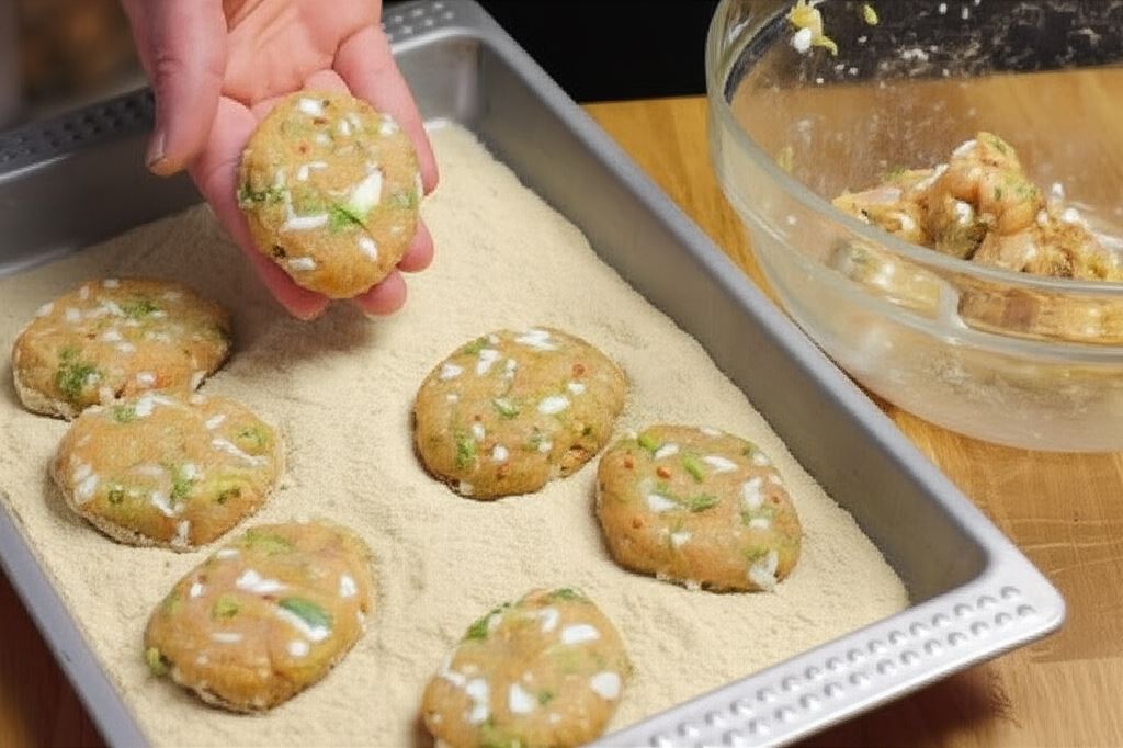 Mokrymi rękoma uformuj niewielkie kotleciki. Potem obtocz je w reszcie bułki tartej.