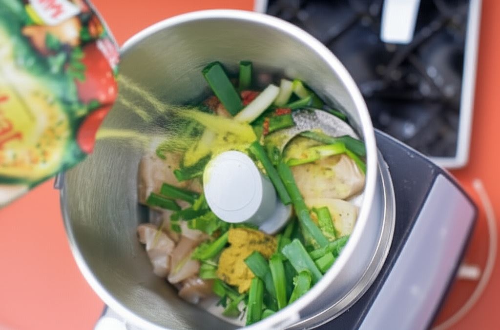 Rybę, dymki, kolendrę, chilli, sok z limonki, przyprawę Knorr oraz pastę curry umieść w malakserze i zmiksuj na niezbyt drobną konsystencję.