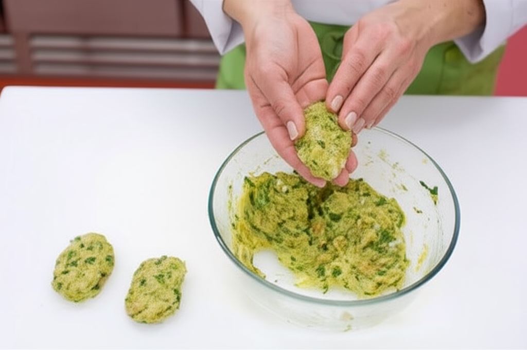 Z przygotowanej masy uformuj w rękach niewielkie kulki, a następnie małe kotleciki.
