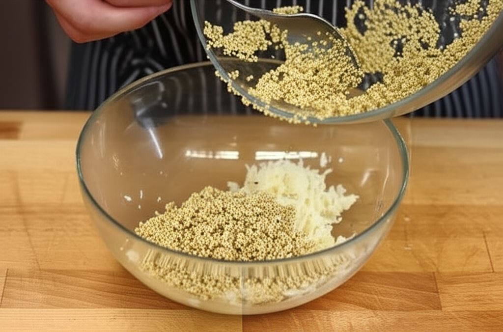 Jedną szklankę komosy przygotuj zgodnie z instrukcją producenta do miękkości. Przygotowaną komosę wsyp do ziemniaków.