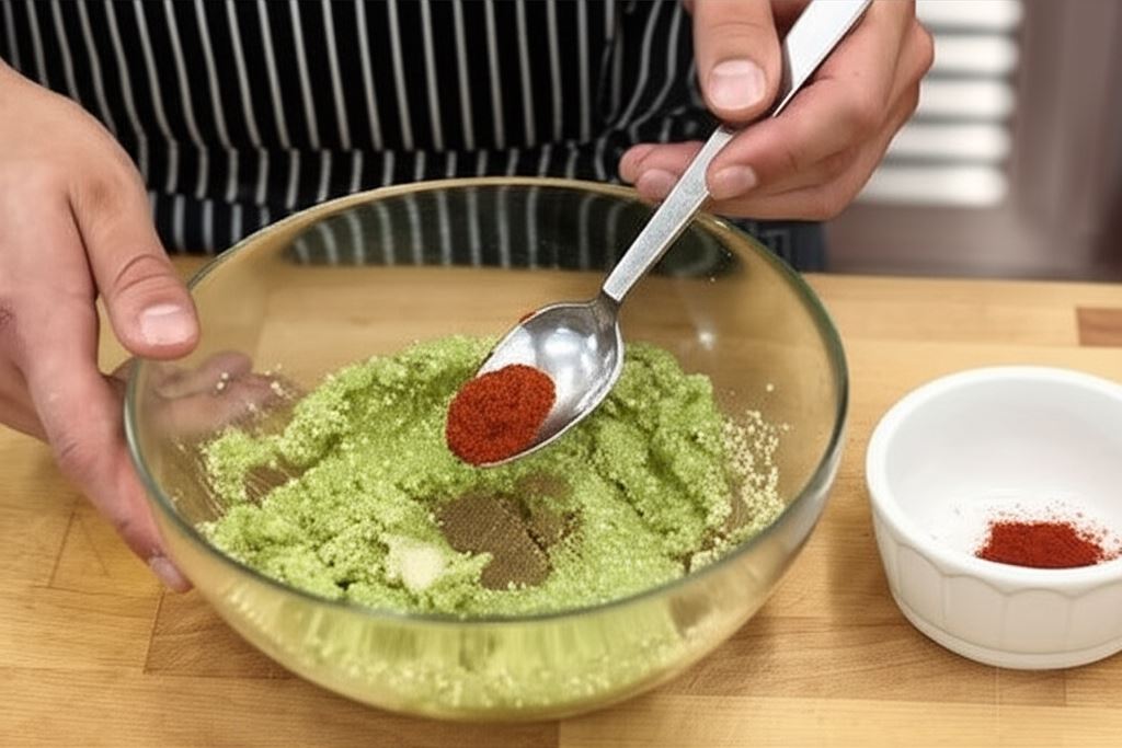 Wsyp ostrą i wędzoną papryczkę oraz mielony kminek – mieszanka powinna być dość zbita. Całość, jeśli uznasz za potrzebne, dopraw do smaku odrobiną soli. Uformuj z tego małe kulki. Kulki spłaszcz do grubości jednego centymetra i obtocz je w bułce tartej lub nasionach sezamu.