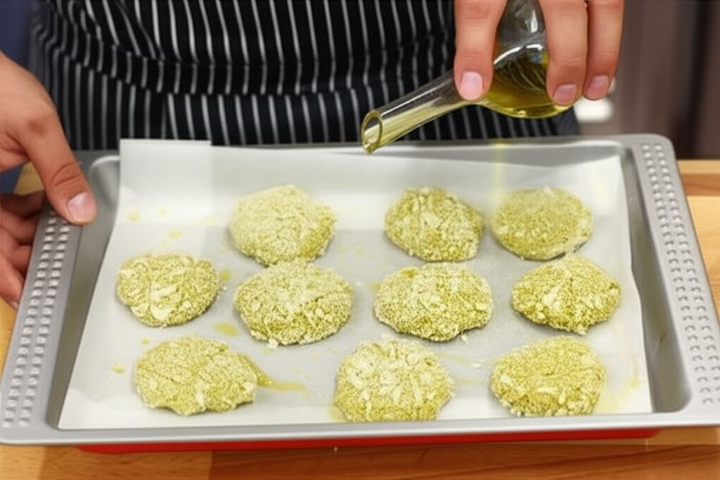 Formę do pieczenia wyłóż papierem pergaminowym i pokrop lekko oliwą. Umieść na niej kotleciki delikatnie skropione oliwą, także od góry. Kotleciki włóż do rozgrzanego do 190ºC piekarnika na około 20 minut.