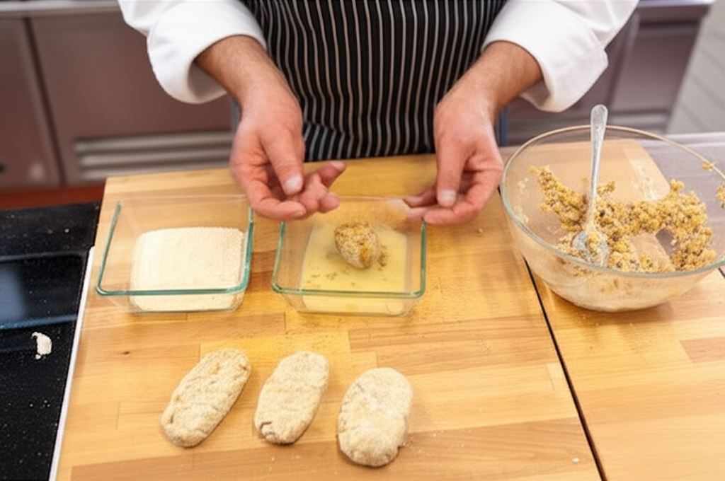 Z uzyskanej masy formować podłużne kotlety, obtaczać w roztrzepanym jajku i bułce tartej.