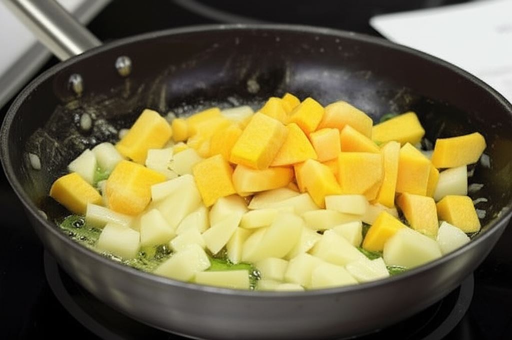 Po chwili wsyp ziemniaki, dynię i kawałki jabłka, wszystko duś 5 minut.