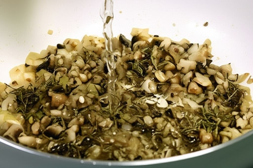 Na oleju podsmaż cebulę i pieczarki pokrojone w kostkę. Po chwili wsyp tymianek i dolej wino. Gotuj do momentu redukcji.