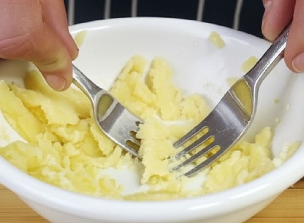Ziemniaki ugotuj, odlej, poczekaj aż odparuje nadmiar wody i rozgnieć z margaryną na purée.