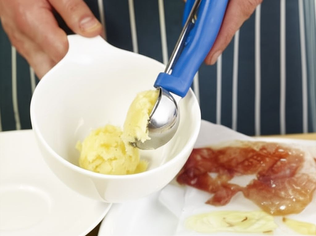 Używając gałki do lodów umieść porcję purée w naczyniu na zupę.