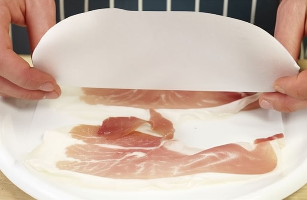 Przygotuj chipsy z szynki i pora, wykorzystując mikrofalówkę. Szynkę potnij w plasterki, a pora w cienkie paski. Umieść je między dwoma arkuszami papieru pergaminowego i wstaw do kuchenki mikrofalowej. Szynkę piecz przez 40 sekund, a pora przez 2,5 minuty na najwyższej mocy.