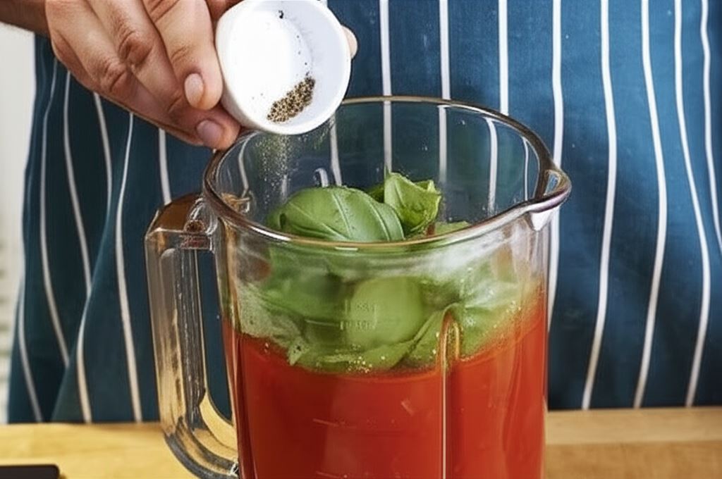 Wsyp bazylię, cukier i świeżo zmielony pieprz, po czym wszystko zmiksuj.