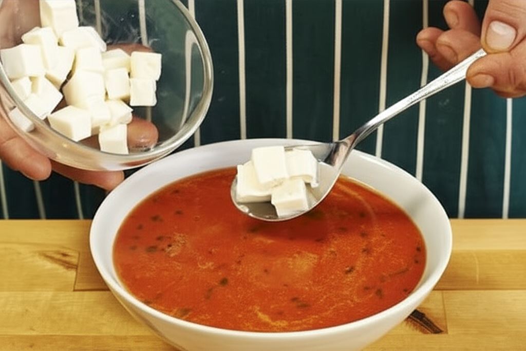 Przelej zupę na głęboki talerz. Dodaj pokrojoną w kostkę mozzarellę.