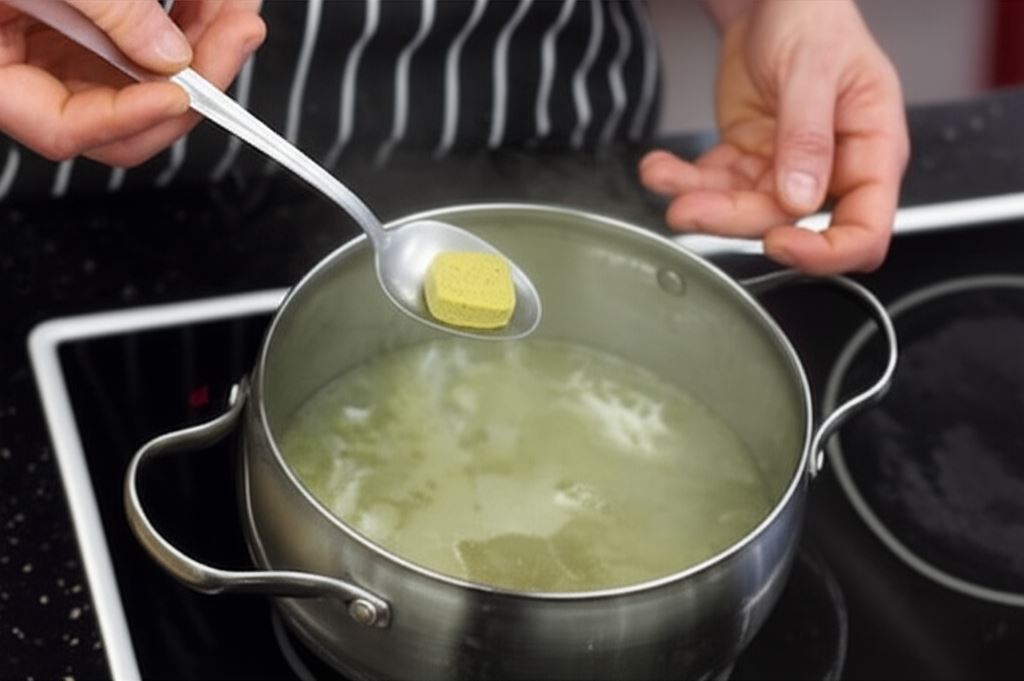 W garnku na rozgrzanym tłuszczu zrumień pokrojoną w kostkę cebulę i czosnek. Następnie wlej 700 ml wody, aby zupa była właściwie doprawiona wsyp kostkę rosołową i ziemniaki. Gotuj aż ziemniaki zmiękną.