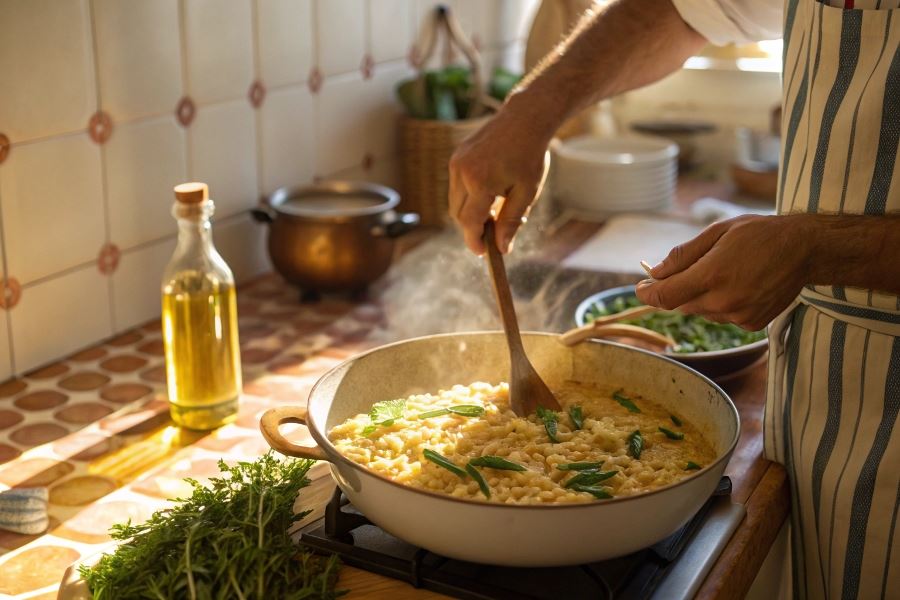 Najbardziej cenioną metodą przygotowania jest technika risotto, polegająca na stopniowym dodawaniu płynu do podsmażonego na oliwie makaronu. Najpierw podsmażamy kritharaki na oliwie z oliwek przez 1-2 minuty, następnie dodajemy gorący bulion porcjami (po około 100 ml), czekając aż płyn zostanie wchłonięty przed dodaniem kolejnej porcji. Ta metoda zapewnia kremową konsystencję i intensywny smak.