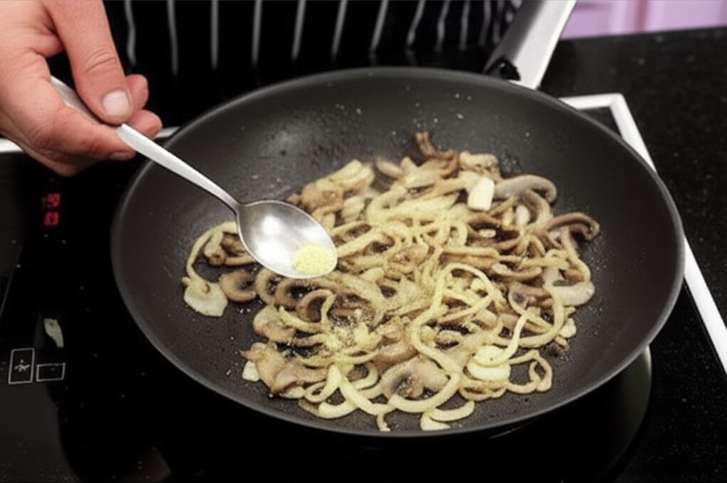 Pieczarki i cebulę pokrój na plastry, potem zrumień wszystko na oleju, dopóki woda całkowicie nie wyparuje. Farsz przypraw według uznania. Odstaw do wystygnięcia.