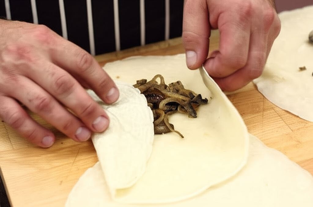 Mąkę, 400 ml ciepłej wody i jajko połącz i przygotuj ciasto. Usmaż naleśniki. W gotowe placki włóż farsz grzybowy, zaginając wszystkie brzegi do środka. Całość na końcu dokładnie zwiń.
