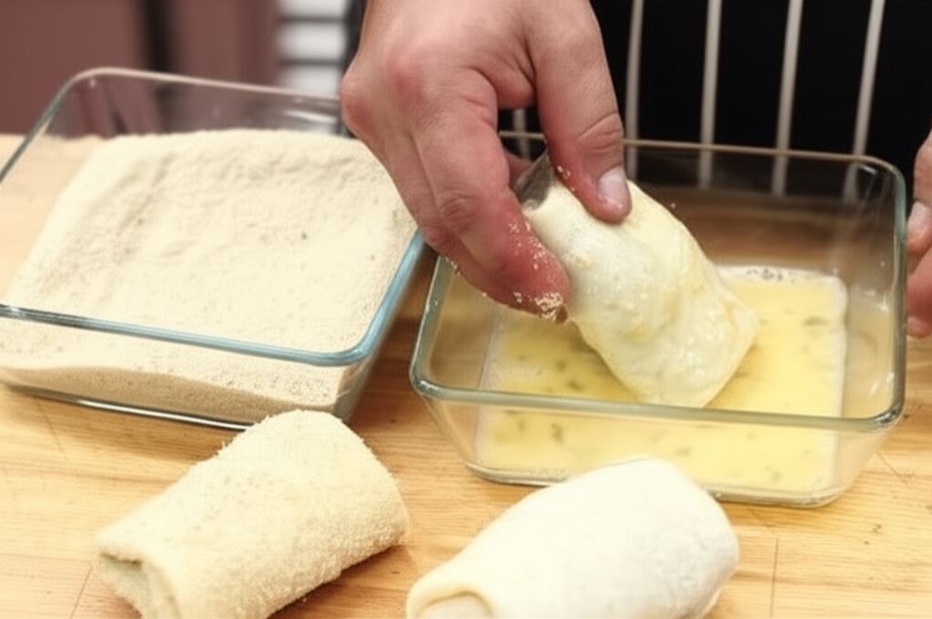Naleśniki obtaczaj, zanurzając je w roztrzepanym jajku i bułce tartej. Krokiety smaż do złotego koloru.