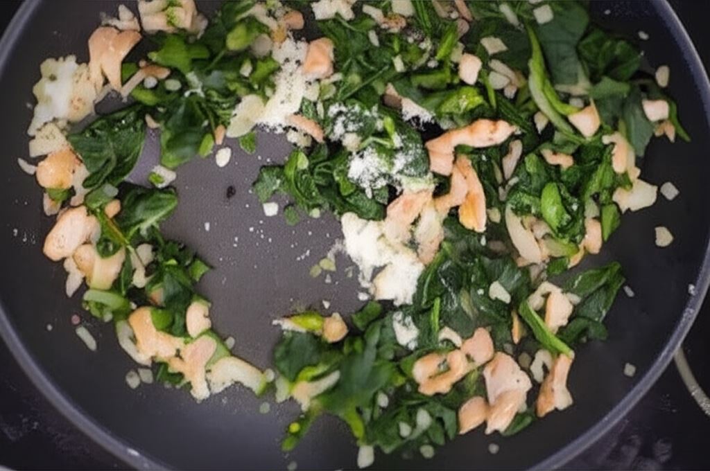 Łososia potnij w paski, cebulę w kostkę. Na rozgrzanym oleju zesmaż cebulę, wsyp łososia, a potem szpinak. Całość przypraw pokruszoną mini kostką Knorr i pieprzem cayenne. Gotuj aż płyn odparuje. Na końcu wsyp bułkę tartą i zamieszaj.