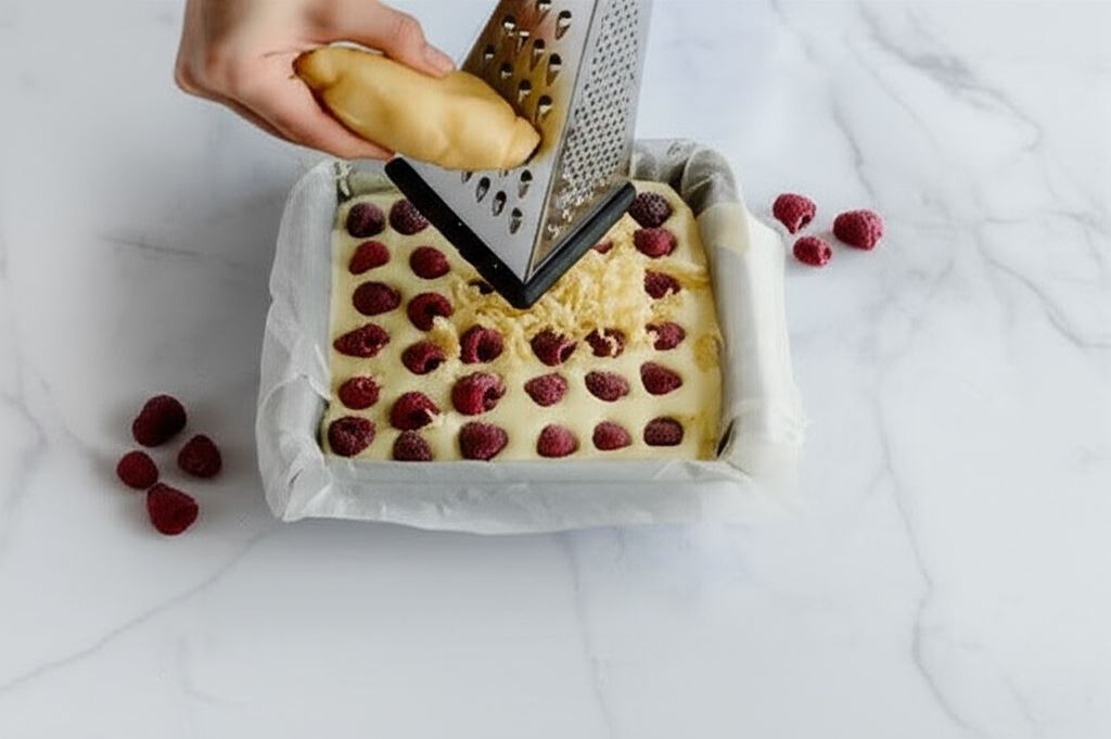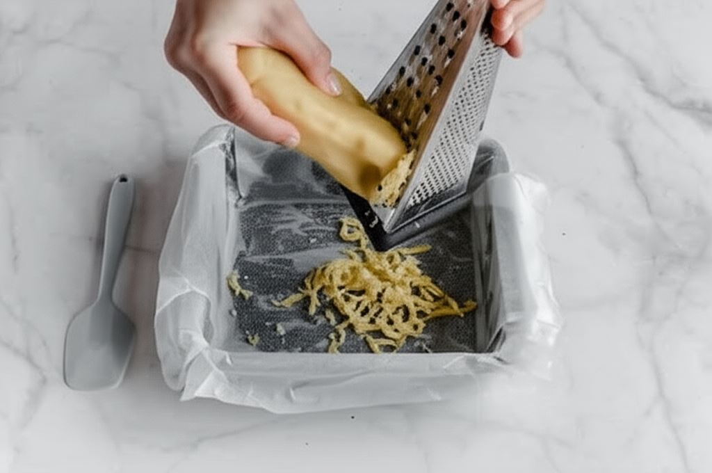 Rozgrzewamy piekarnik do 180 C. Formę smarujemy masłem i wykładamy papierem do pieczenia. Na spód ścieramy większość ciasta, lekko dociskamy. Pieczemy aż się zrumieni około 20 min. Zostawiamy do ostygnięcia.