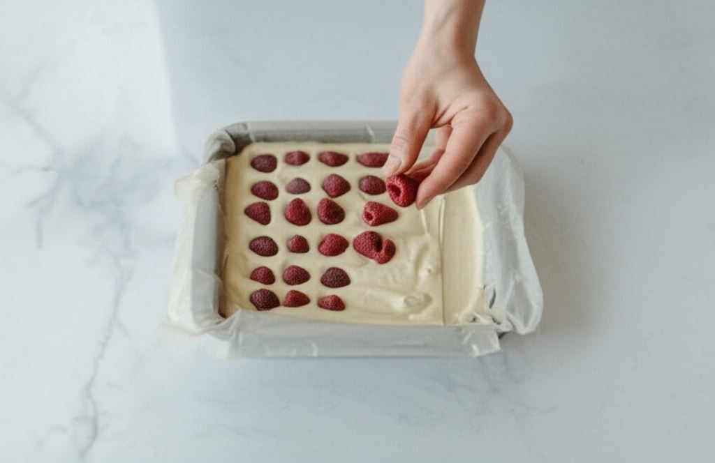 Uzyskaną mieszankę wylewamy na podpieczony spód. Potem rozkładamy maliny (nie rozmrażamy ich wcześniej).