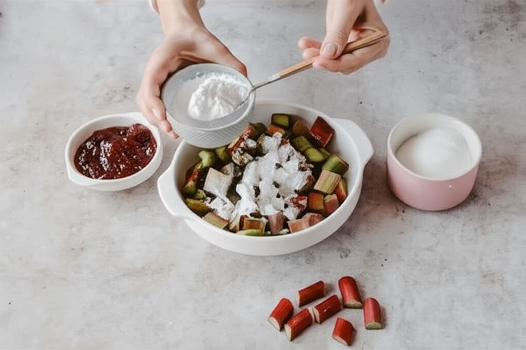 Rabarbar tniemy na kawałki o długości 1 cm. Wsypujemy do miski. Wsypujemy mąkę ziemniaczaną, cukier i dodajemy konfiturę. Mieszamy dokładnie.
