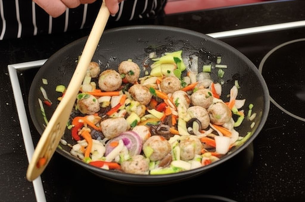 Podsmażaj kulki na patelni, następnie dodaj odmrożone warzywa.