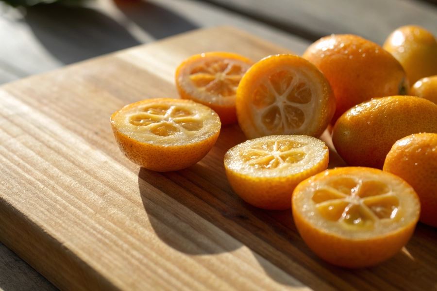 Charakterystyczny smak kumkwatu to fascynujący kontrast między słodką, aromatyczną skórką a kwaśnym, orzeźwiającym miąższem, przypominającym intensywną mandarynkę.
