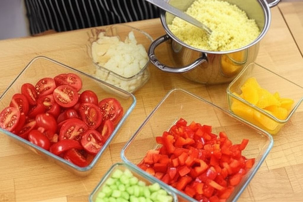 Kaszę jaglaną przygotuj na sypko zgodnie z instrukcją na opakowaniu. Warzywa pokrój w kostkę, pomidorki przekrój na połówki, a pomarańczę podziel na segmenty.