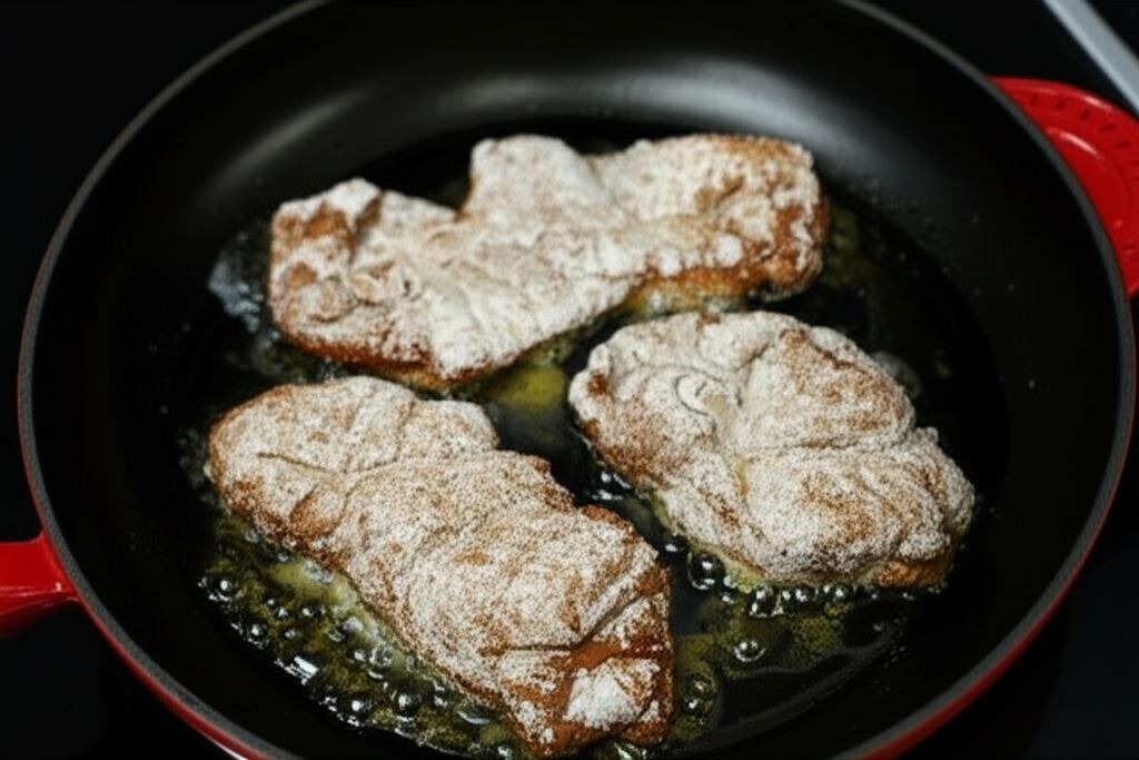 Zamarynowane porcje mięsa obtocz jeszcze w mące. Przyrumień z obu stron na złocisty kolor na gorącej oliwie. Kurczaka odłóż na bok.
