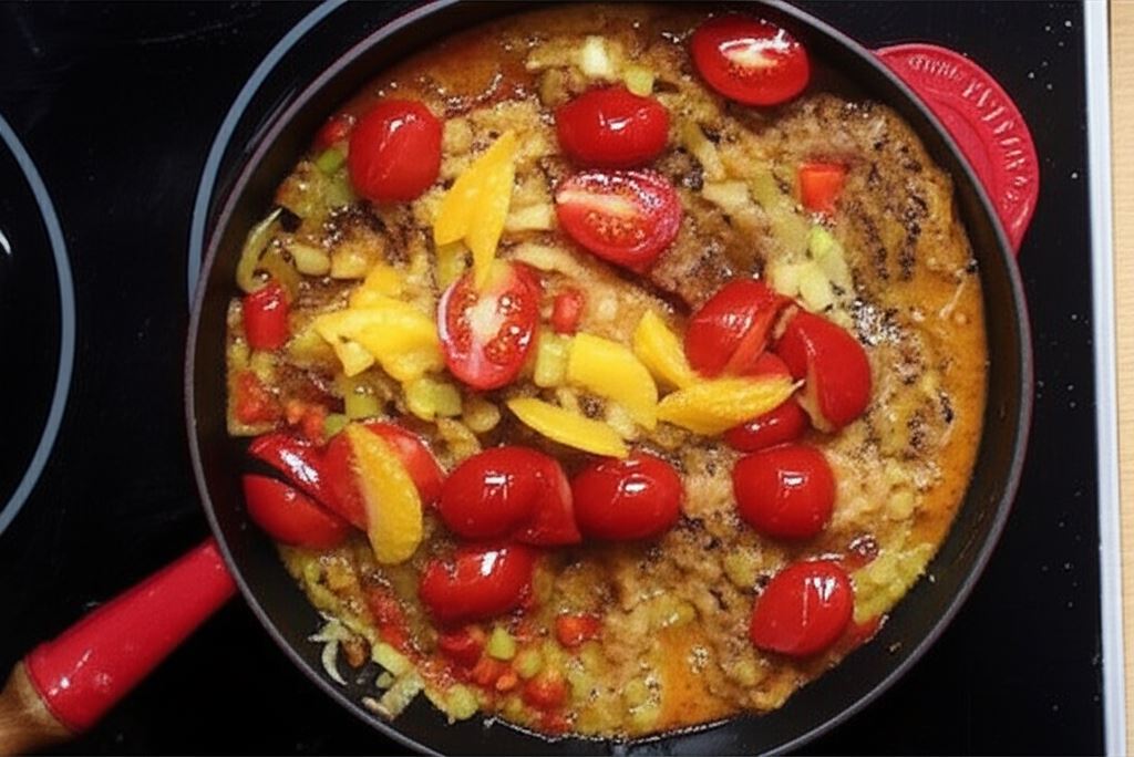 Wrzuć pomidory koktajlowe, posiekaną kolendrę oraz cząstki pomarańczy. Całość gotuj razem jeszcze przez minutę. Na zakończenie przypraw danie kilkoma kroplami sosu tabasco.