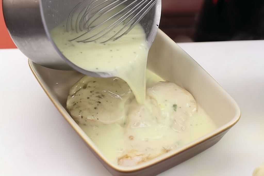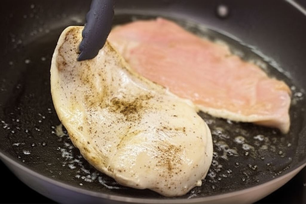 Filety z kurczaka przypraw lekko solą i pieprzem i zrumień na gorącym oleju przez kilka minut z każdej strony. Potem przenieś do naczynia żaroodpornego.