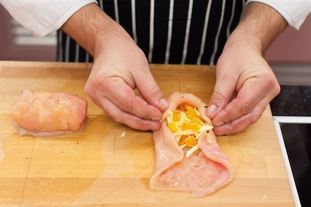 Wymieszaj starty ser z suszoną morelą pokrojoną w paseczki i umieść nadzienie na każdym kawałku mięsa. Zwiń całość, zawijając brzegi do środka tak, by farsz nie wyciekł w trakcie smażenia. Morelę możesz zamienić innym owocem, na przykład suszoną śliwką.