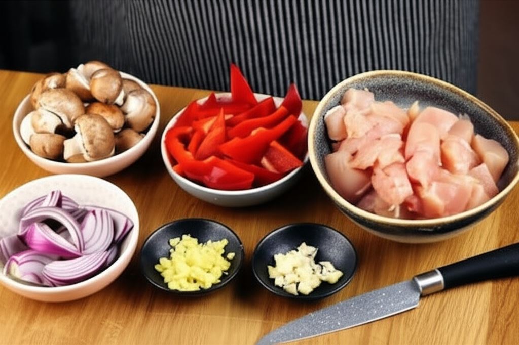 Cebulę i paprykę obierz, pokrój w trójkąty, czosnek, imbir posiekaj, pieczarki przekrój na połówki, a kurczaka pokrój w kostkę 2x2 cm.