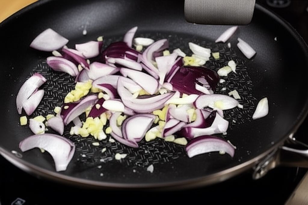 Rozgrzej olej na patelni i zrumień czosnek, imbir i cebulę, potem dodaj kurczaka i smaż wspólnie około 5 min.