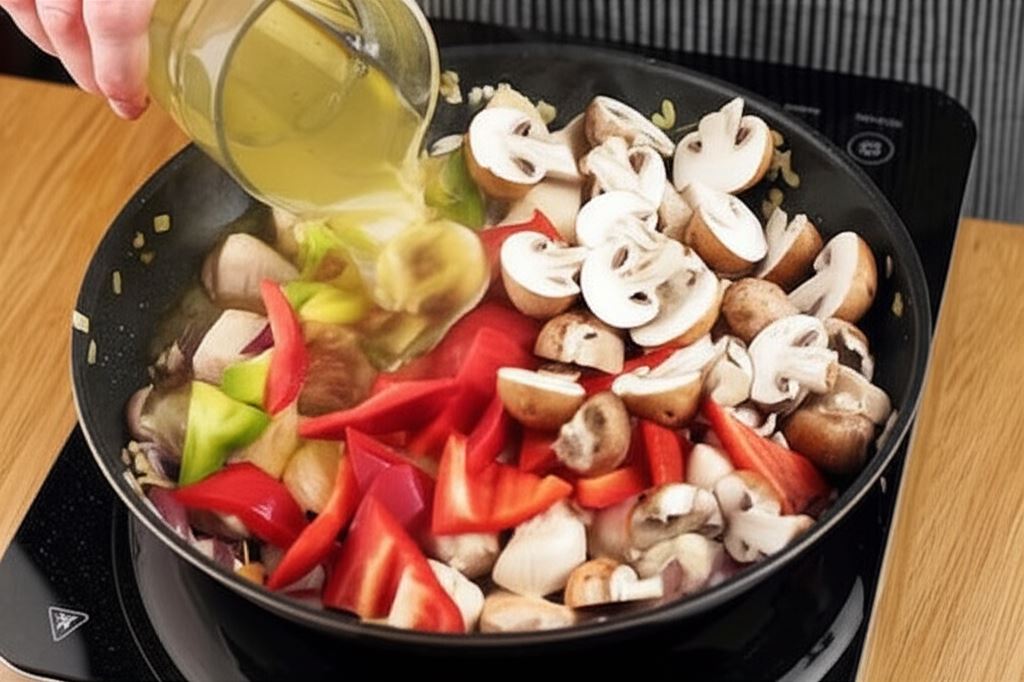 Wsyp paprykę, grzyby, wszystko zalej bulionem i gotuj przez następne 5 min.
