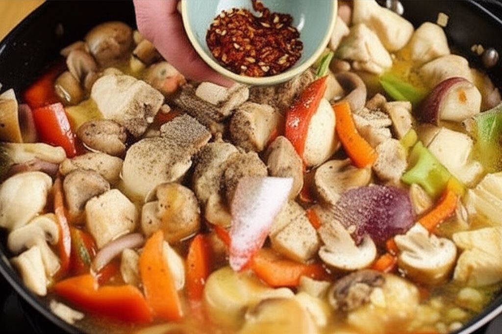 Możesz modyfikować poziom ostrości dania, dostosowując ilość płatków chili z wędzoną papryką. Jeśli lubisz eksperymentować, spróbuj dodać inne warzywa, np. cukinię, marchewkę lub pędy bambusa. Kurczaka możesz również zastąpić tofu, aby stworzyć wegetariańską wersję tej potrawy. Dla dodatkowego aromatu posyp danie świeżą kolendrą zamiast szczypiorku.