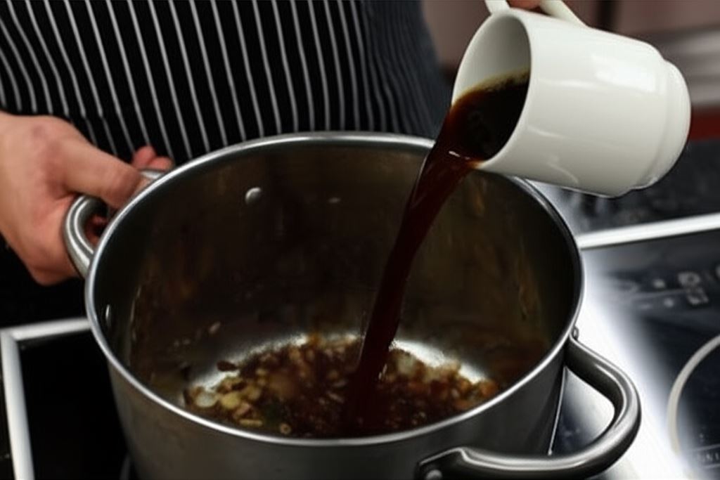 Cebule posiekaj w małą kosteczkę i zrumień ją w garnku na gorącej oliwie. Wsyp cukier Muscovado i skarmelizuj go. Do naczynia wlej kawę, wsyp cynamon, kmin, ketchup i goździki. Wszystko gotuj do momentu, aż sos stanie się gęsty.