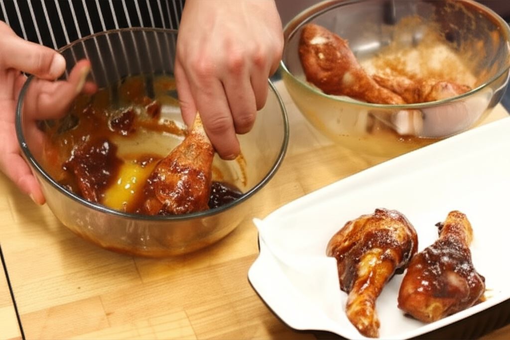 Kurczaki zanurz obłóż marynatą i umieść w naczyniu żaroodpornym na papierze do pieczenia. Całość nakryj folią aluminiową. Włóż do rozgrzanego do 180°C piekarnika na około 45 minut.