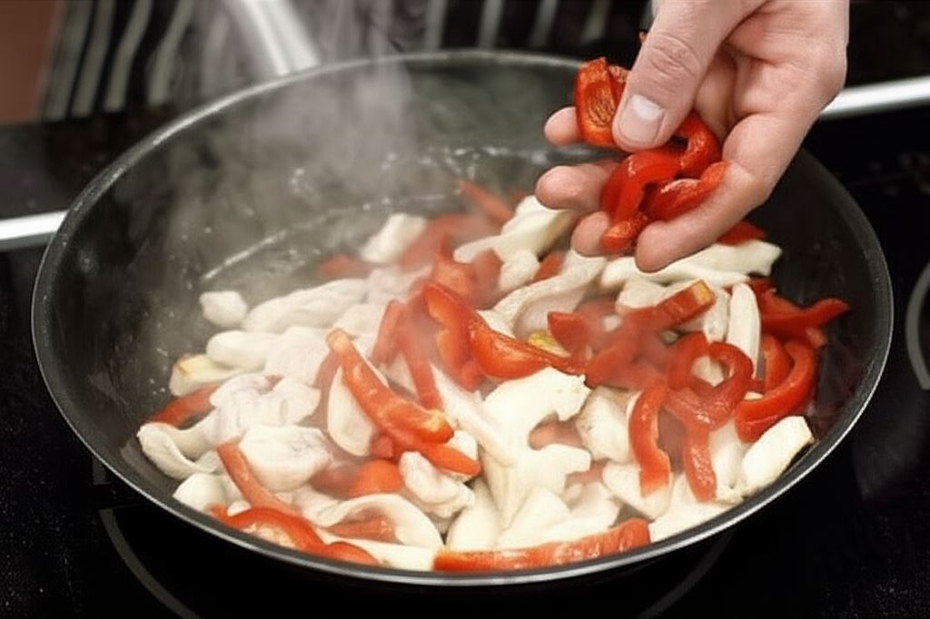 Pokrój mięso i paprykę w paski.