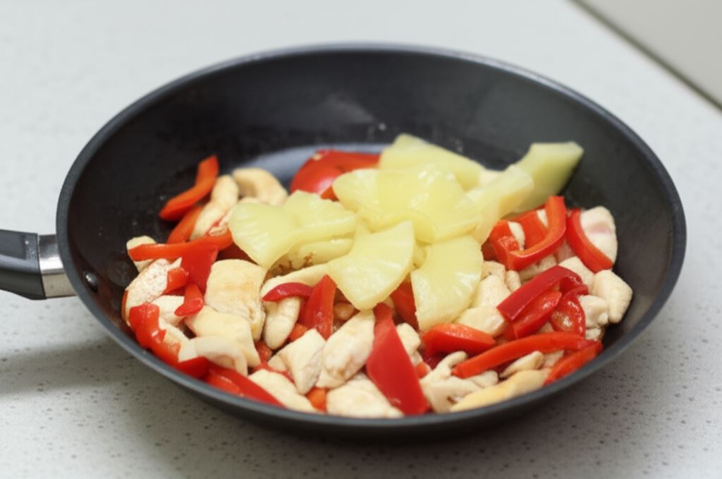 Przyrumień na patelni i dodaj odcedzonego z zalewy ananasa.