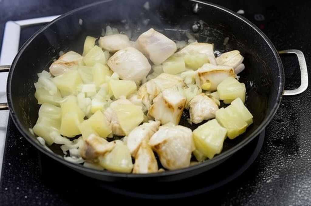 Filety z kurczaka pokrój w dużą kostkę, obsmaż na patelni na rozgrzanym oleju, dodaj posiekaną w drobną kostkę cebulę i kawałki ananasa, wszystko razem smaż, nieustannie mieszając, przez około 4 minuty.