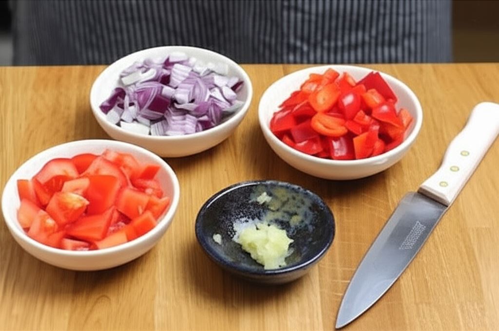 Paprykę, pomidory oraz cebulę pokrój w kostkę, czosnek drobno posiekaj.