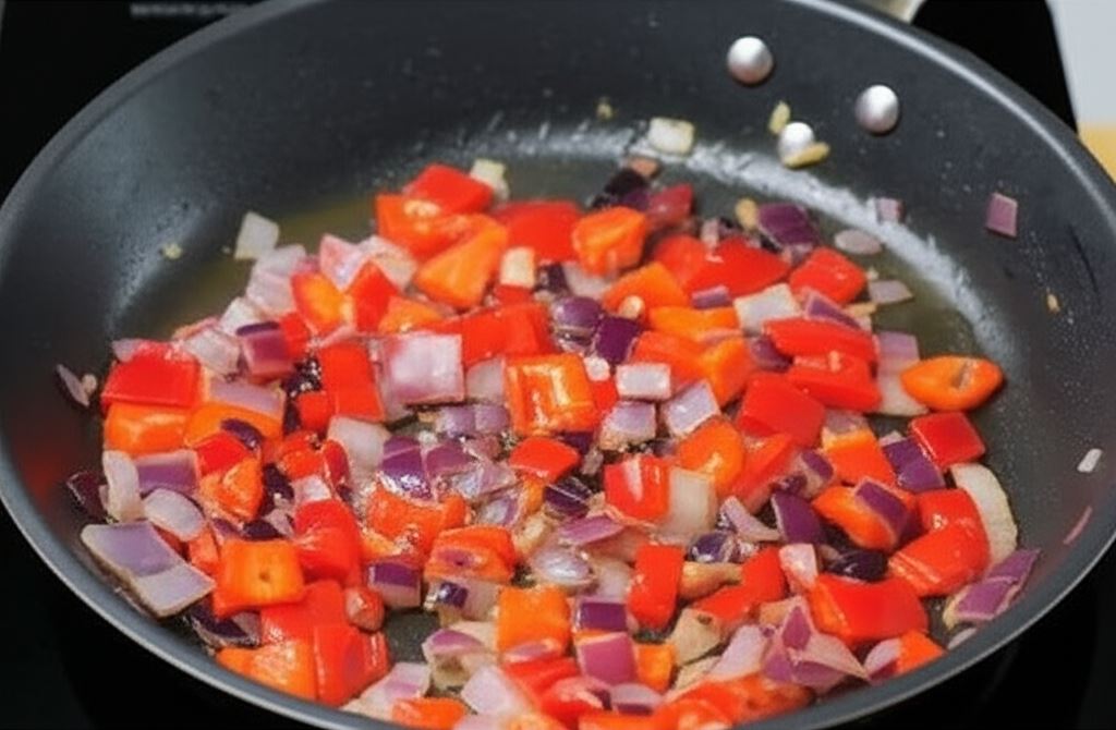 Czosnek, cebulę i paprykę zrumień na patelni na gorącym oleju. Dorzuć pomidory i smaż dopóki się rozpadną.
