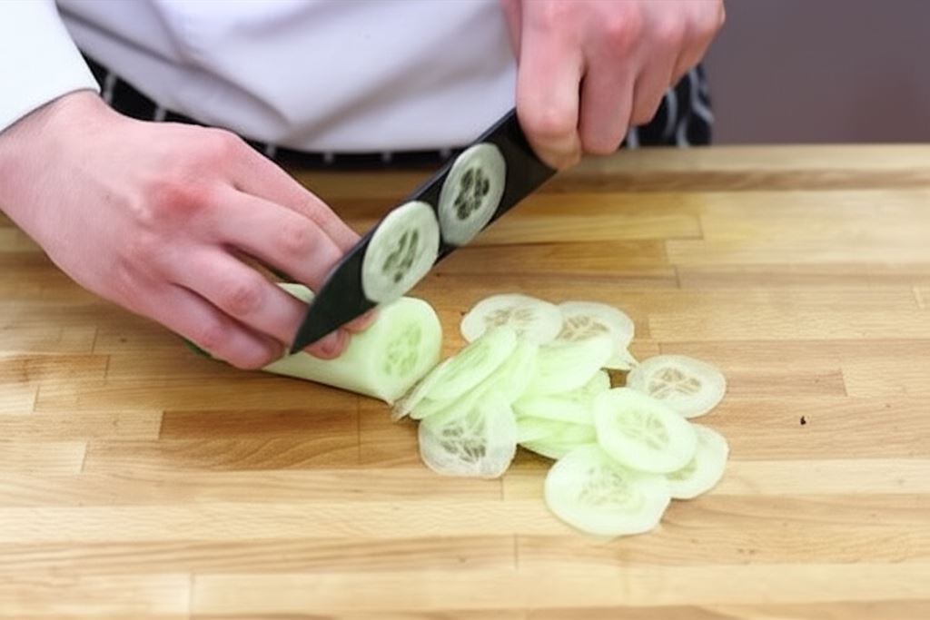 Obierz ogórki i pokrój je w cienkie plastry, odcinając końcówki.