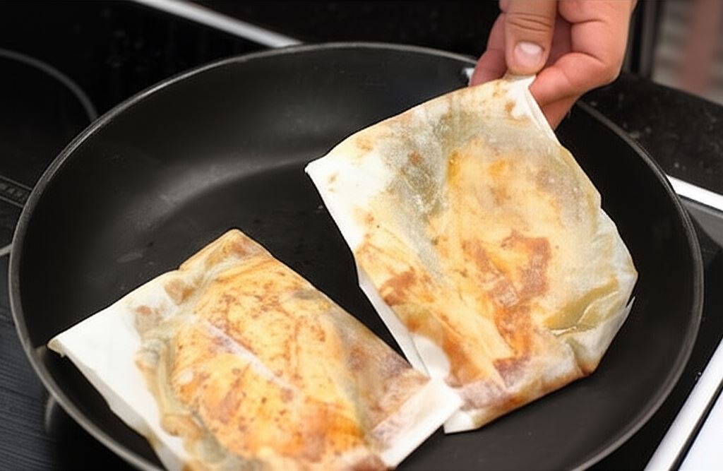 Zamknij dokładnie torebki i umieść płasko na patelni. Smaż na średnio nagrzanym ogniu przez około 5-6 minut z obu stron. Najlepiej serwuj z ryżem.